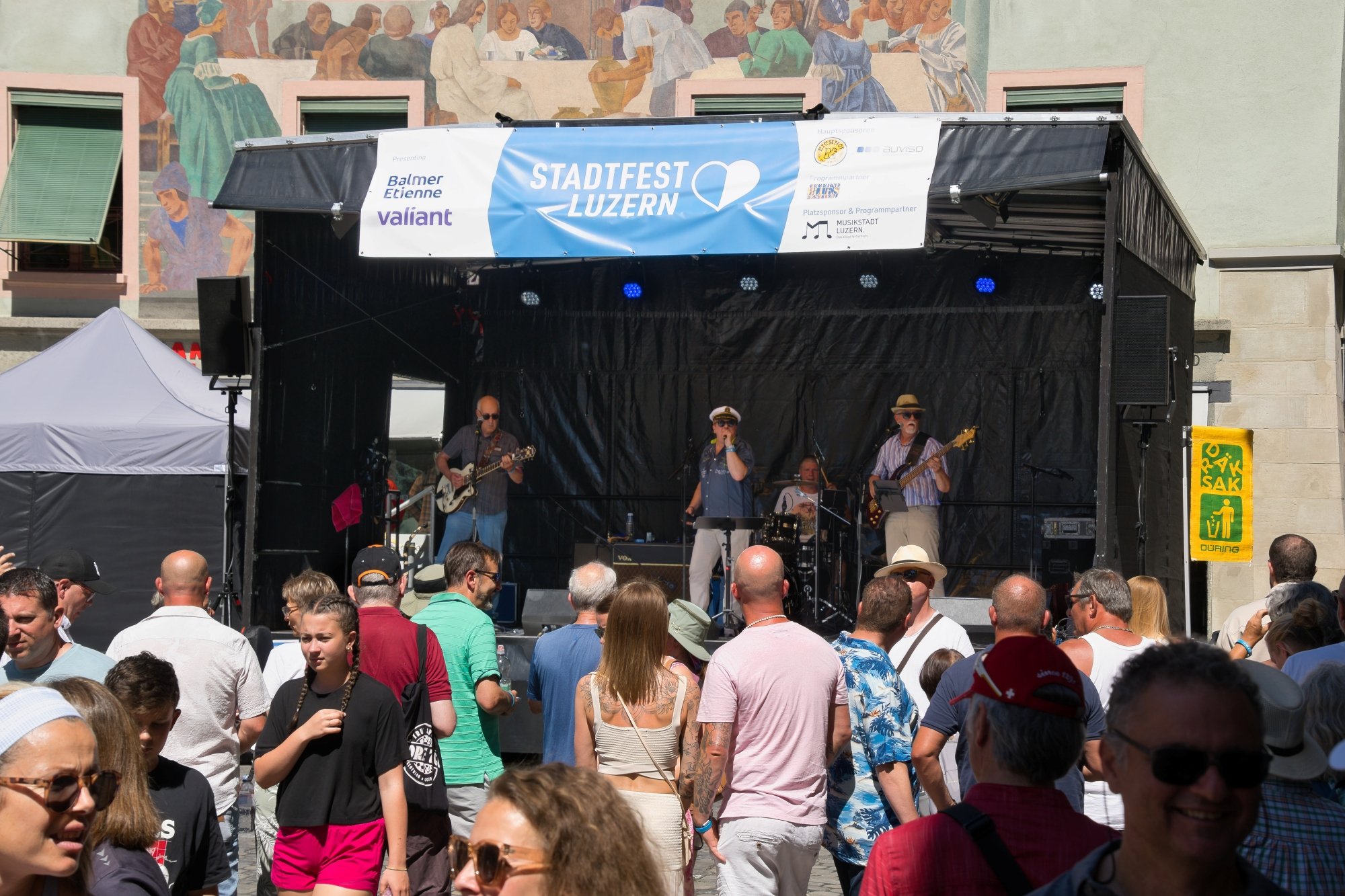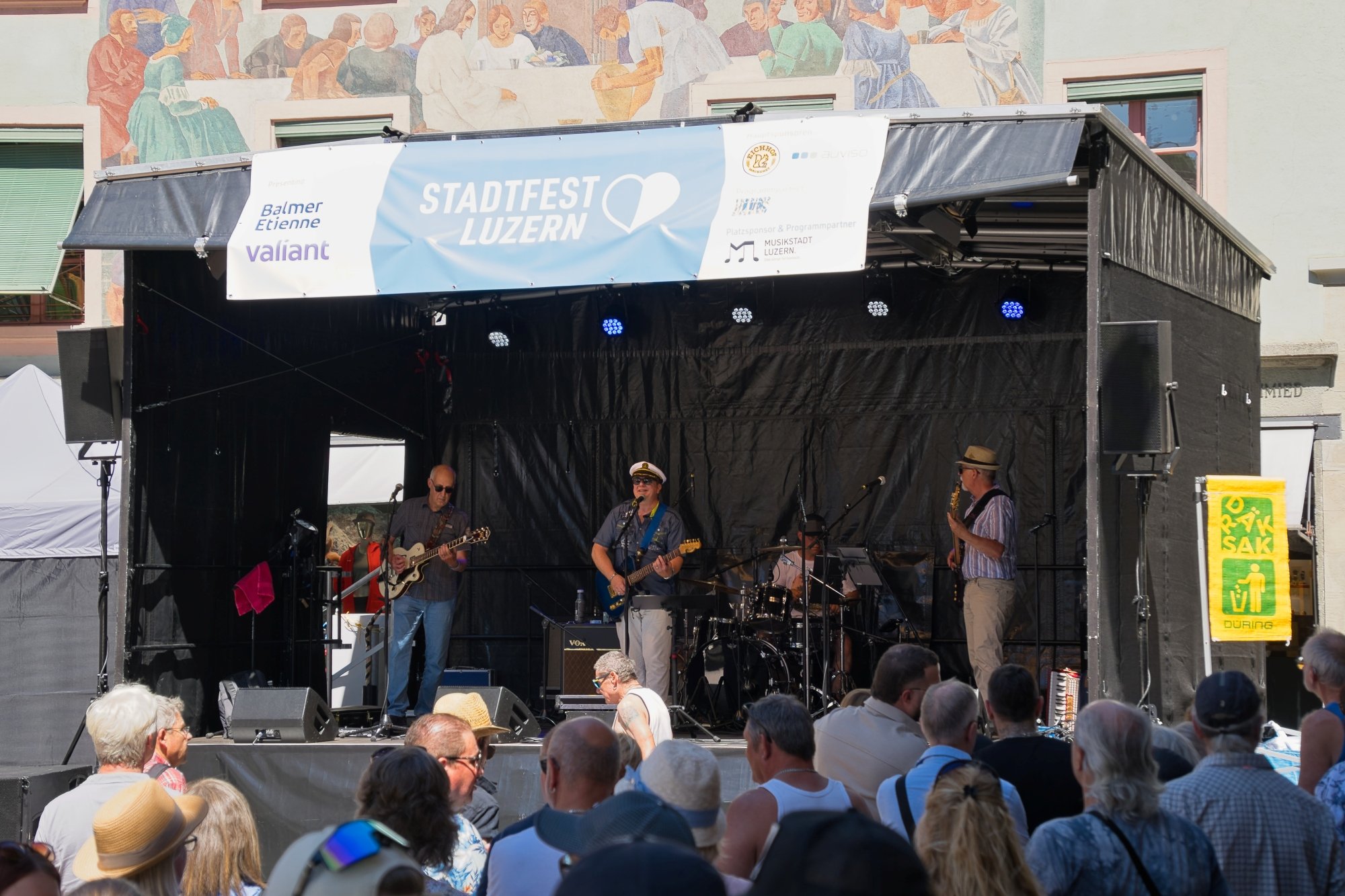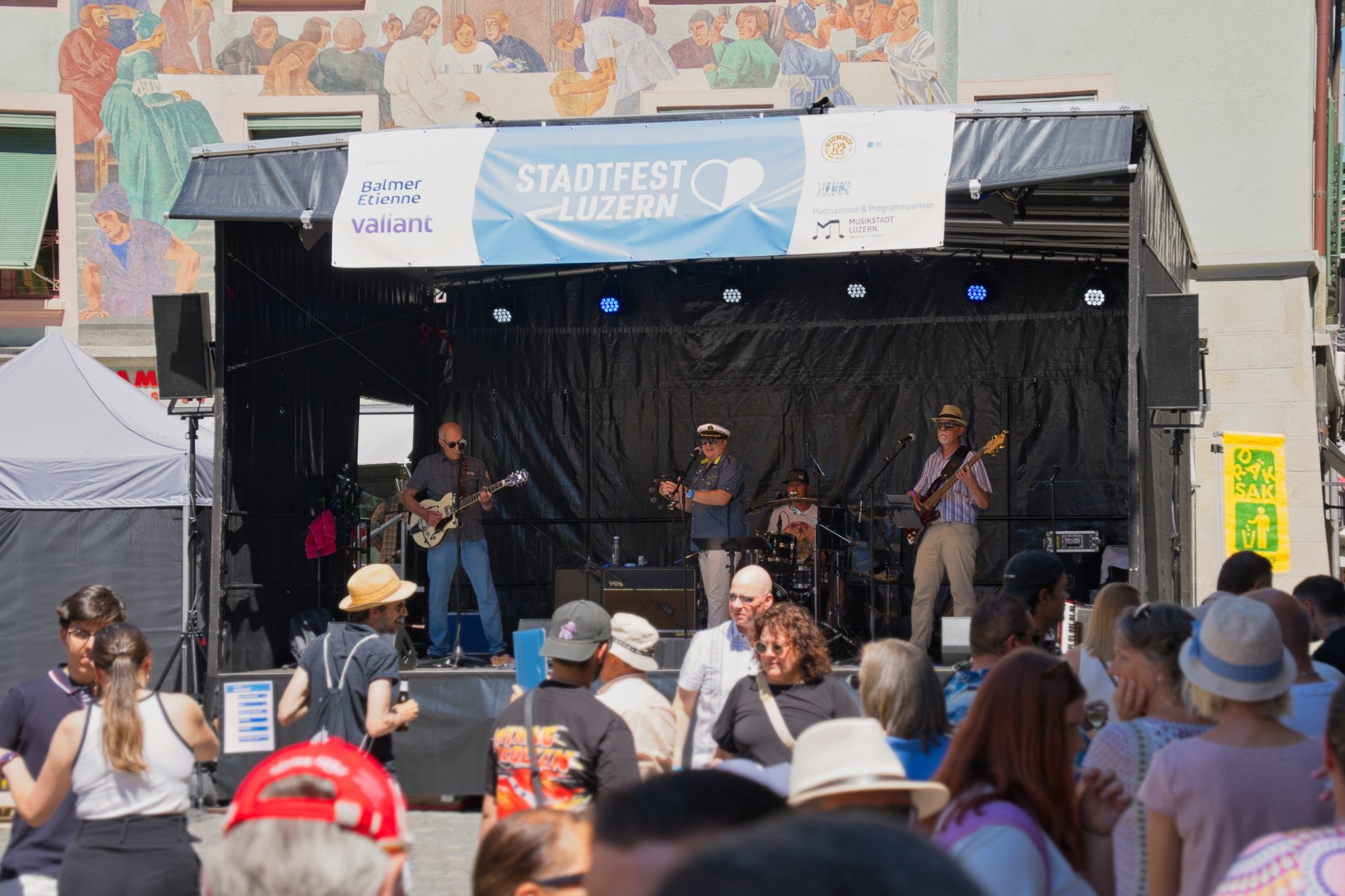 Unter dem Motto "entdecke - fiire - begägne" verwandelte sich Luzern in eine lebendige Bühne. Trotz der sengenden Temperaturen am Nachmittag von über 30°C sorgten Ronny & the Jukebox Gang auf dem Weinmarkt für «heisse» und mitreissende Stimmung. Das Publikum suchte zwar gerne Schatten, doch der musikalische Event zog immer mehr Menschen an. Den Stadtfest-Besuchern wird das grossartige Stadtfest noch lange in Erinnerung bleiben.