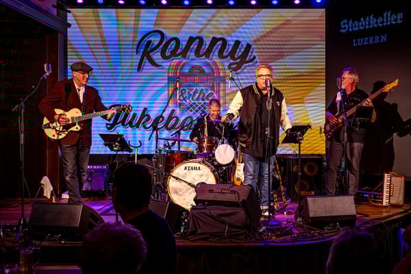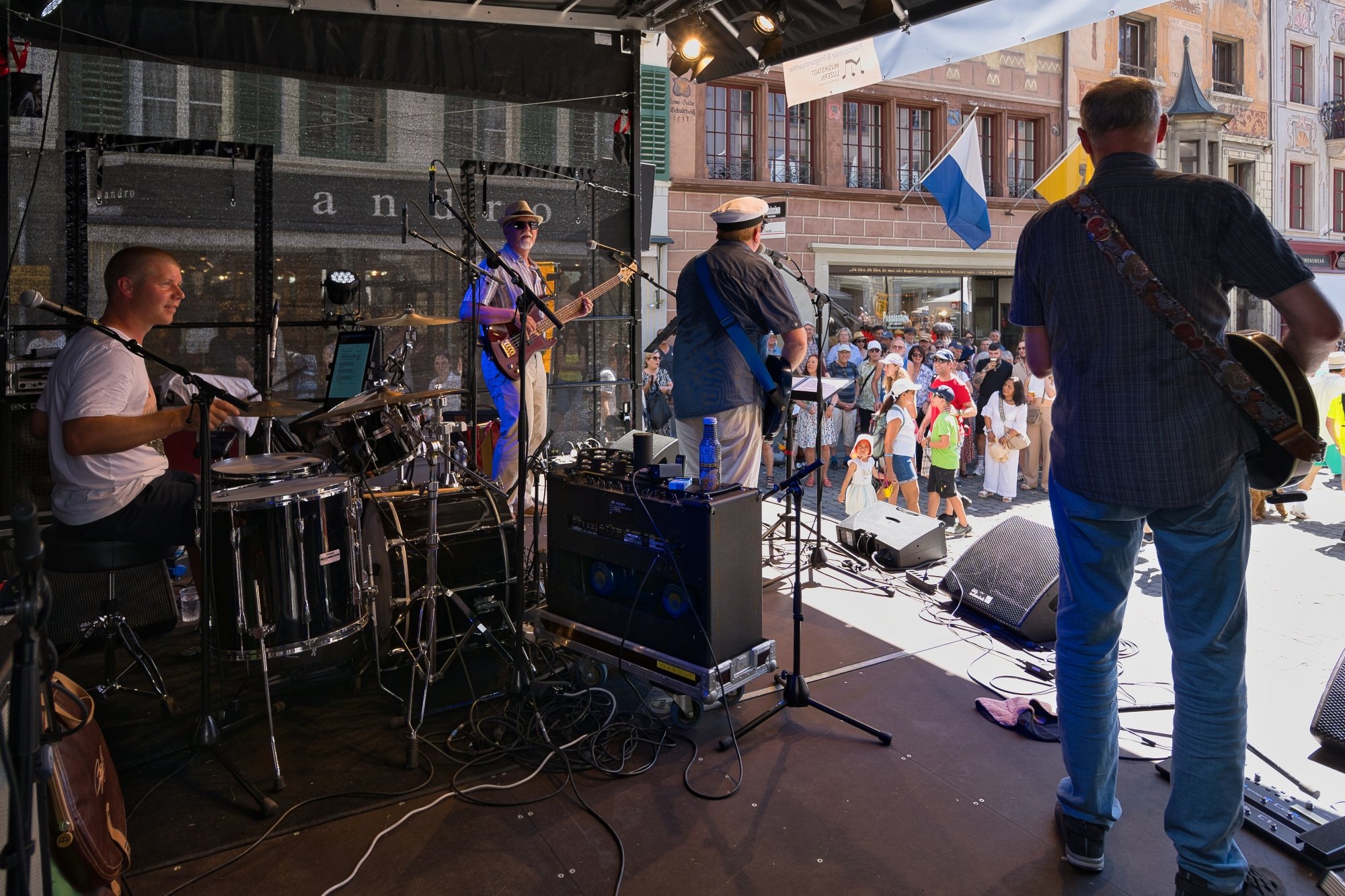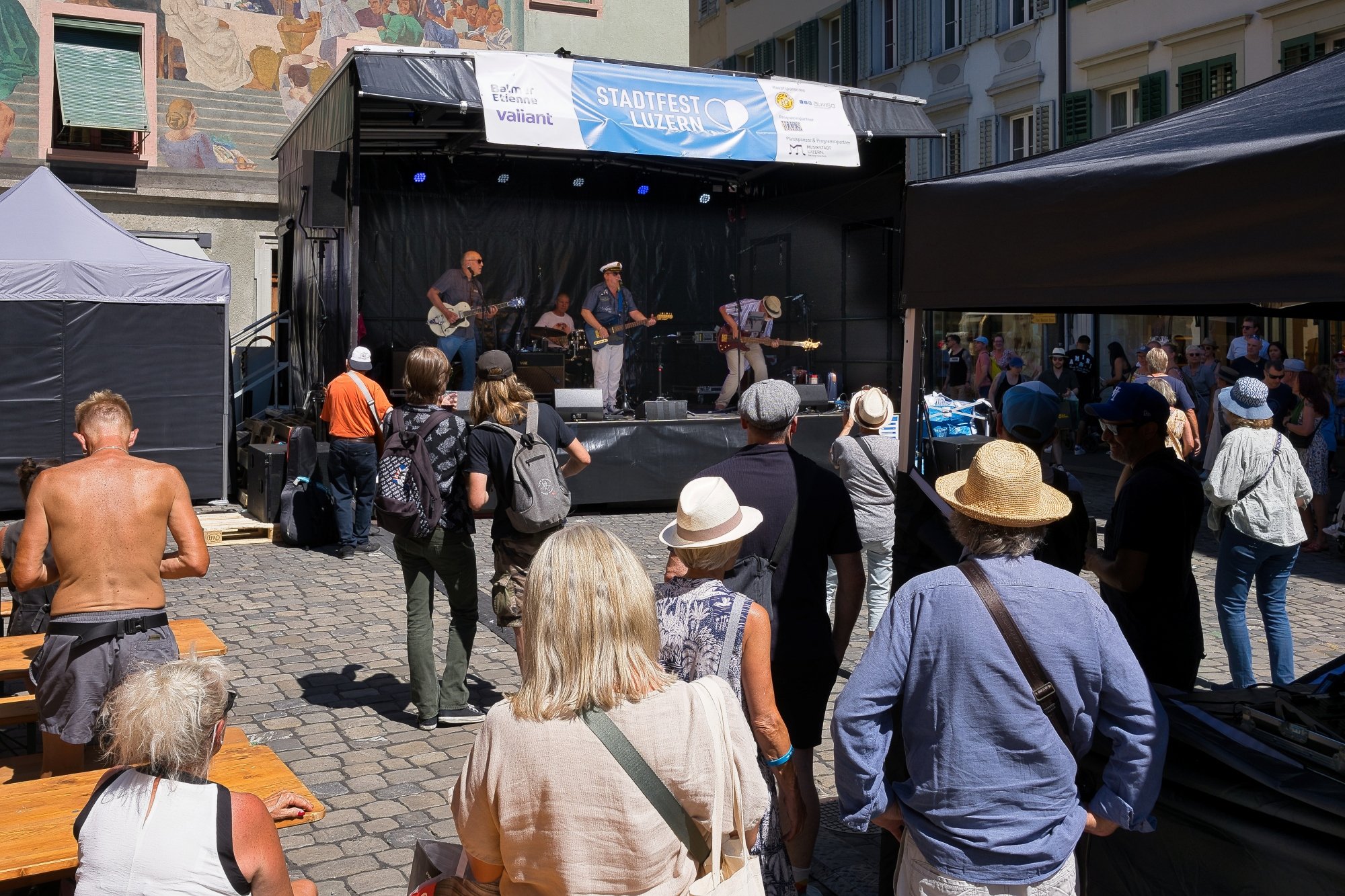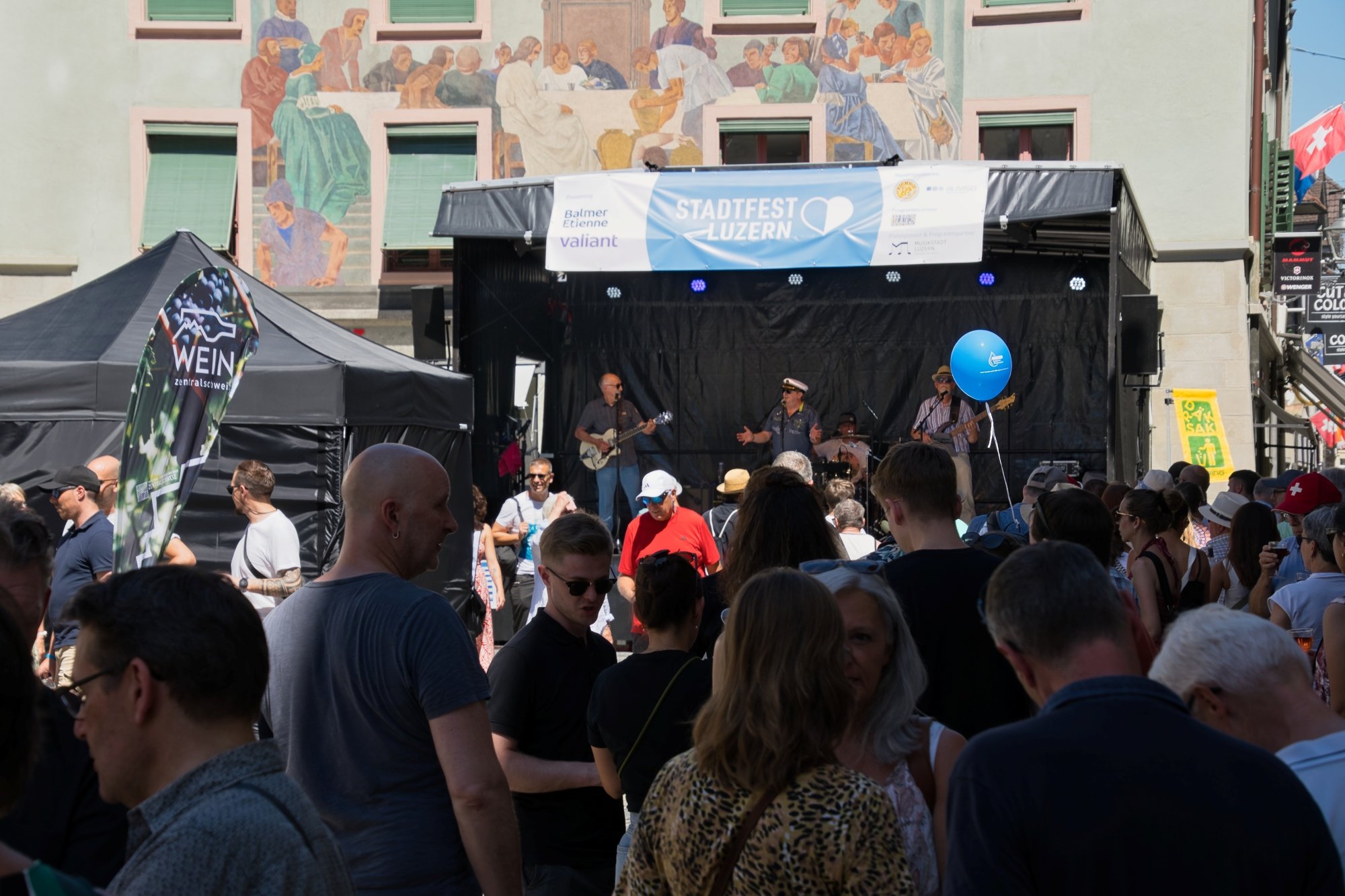 Unter dem Motto "entdecke - fiire - begägne" verwandelte sich Luzern in eine lebendige Bühne. Trotz der sengenden Temperaturen am Nachmittag von über 30°C sorgten Ronny & the Jukebox Gang auf dem Weinmarkt für «heisse» und mitreissende Stimmung. Das Publikum suchte zwar gerne Schatten, doch der musikalische Event zog immer mehr Menschen an. Den Stadtfest-Besuchern wird das grossartige Stadtfest noch lange in Erinnerung bleiben.